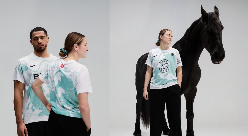 Afin de présenter leur liquette blanche et turquoise, le club a tout simplement fait poser Levi Colwill et Wieke Kaptein aux côtés d’un équidé. La scène est assez improbable, mais réussit à mettre en valeur le maillot et son joli motif inspiré du folklore chinois.
