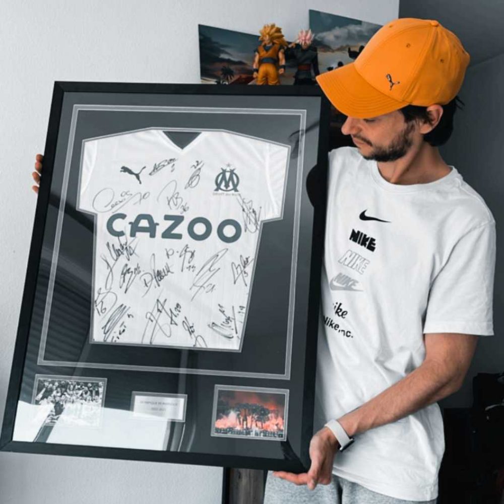 C’est venu d’un voyage. Très grand fan de Cristiano Ronaldo, je suis allé sur son île, à Madère, pour découvrir là où tout a commencé pour lui. En passant devant sa maison, je suis allé au culot demander un stage au club du Marítimo et j’ai été accepté. Un an plus tard, j’y étais encore et j’ai rencontré des proches à lui qui m’ont fait avoir un maillot dédicacé personnellement par CR7 ! J’avais déjà pas mal de maillots de lui et j’achetais des cadres IKEA pour tapisser mon studio. Là, il me fallait plus, il fallait raconter l’histoire de ce maillot, mon séjour là-bas. Donc passer par un encadreur. Sauf que je n’avais pas envie d’envoyer ce maillot par la poste, de stresser à l’idée qu’un inconnu l’abîme… Comme j’ai commencé à travailler dans le marketing et le digital, j’ai mûri l’idée de proposer des cadres personnalisables sur le net. Mon frère étant dessinateur industriel, il m’a conçu un modèle sur-mesure, facile à monter, où l’on peut mettre un texte, des photos. J’ai donc pu me lancer.