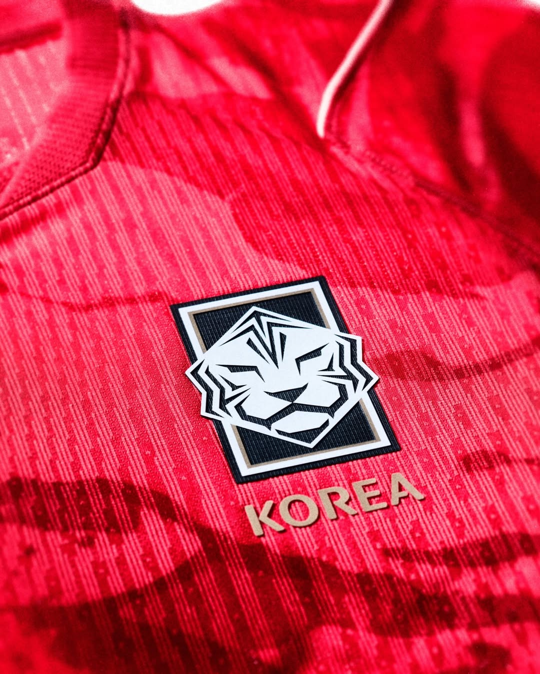 Le maillot domicile rouge part sur un design en hommage au Tigre blanc, symbôle d’un des quatre gardiens de la Corée, mais également de la Féderation sud-coréene de football, avec son motif à rayures.