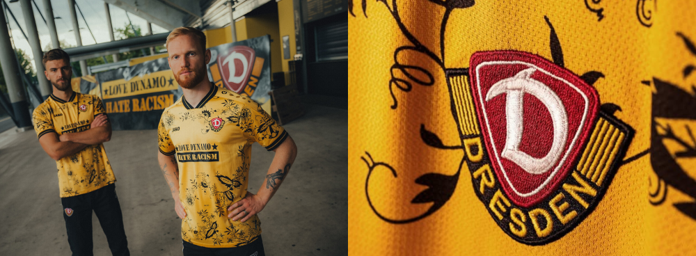 Pour marquer la 15ᵉ journée d’action “Love Dynamo Hate Racism”, le 25 octobre face à Paderborn, le Dynamo Dresden a dévoilé un maillot spécial en édition limitée créé par l’équipementier allemand Jako.
