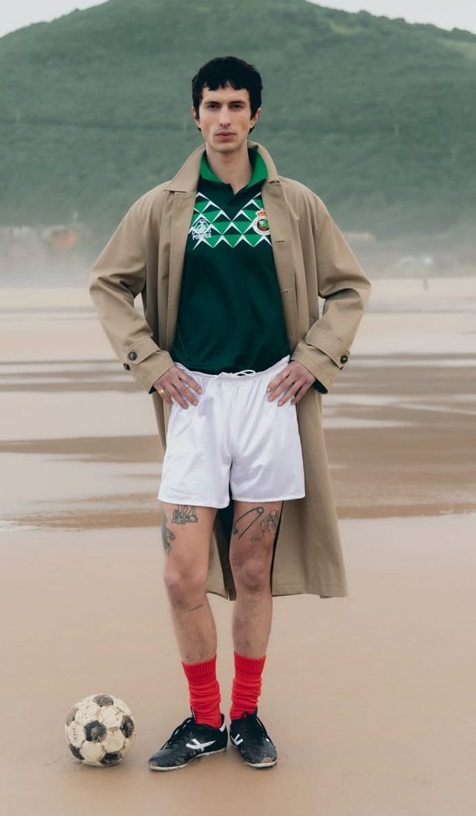 Cette fois-ci, Pompeii est parti sur deux tuniques vintage, chacune avec sa propre esthétique. La version classique mise sur un maillot mi-blanc, mi-vert au motif « pied-de-poule » avec un joli col en V. La version gardien, elle, part sur un tout autre terrain avec un maillot vert foncé à col polo avec un motif triangulaire rétro.