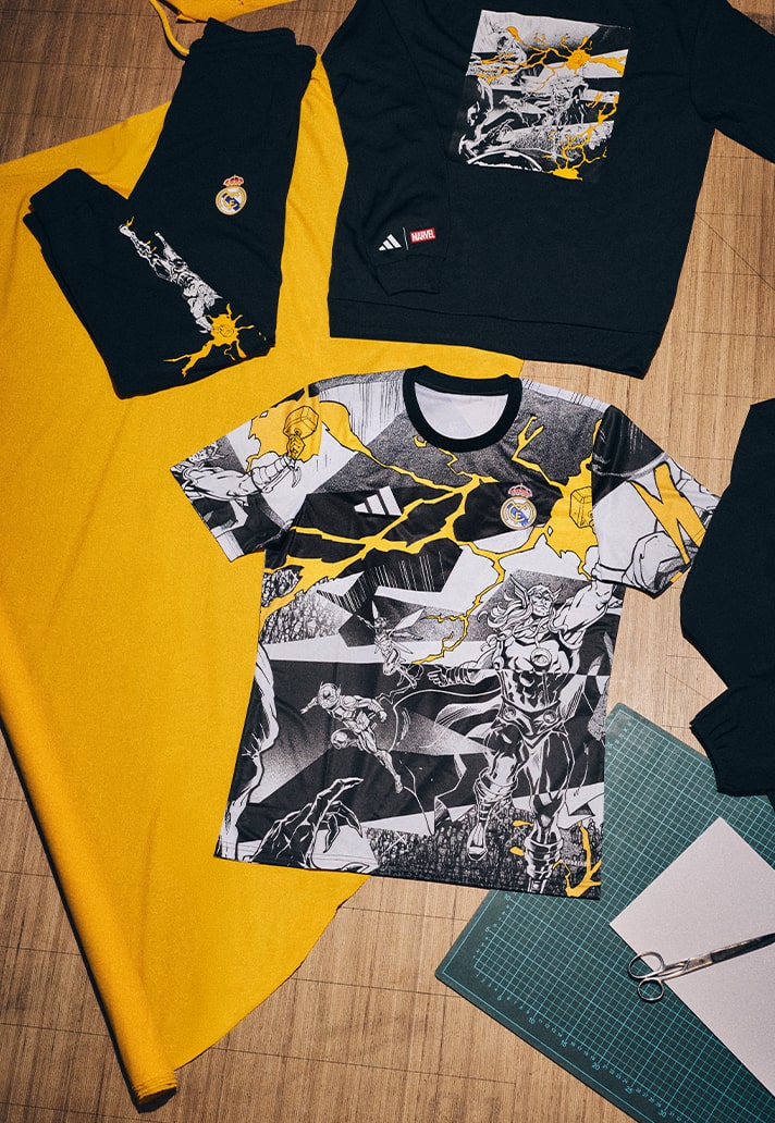 À l’occasion de cette collab’ inédite, on peut retrouver sur le maillot du Real Madrid les super-héros Thor, Ant-Man et la Guêpe, dans une esthétique propre aux comics Marvel. La tunique s’accompagne d’une collection lifestyle plutôt sympathique, à retrouver sur la boutique en ligne du Real Madrid.