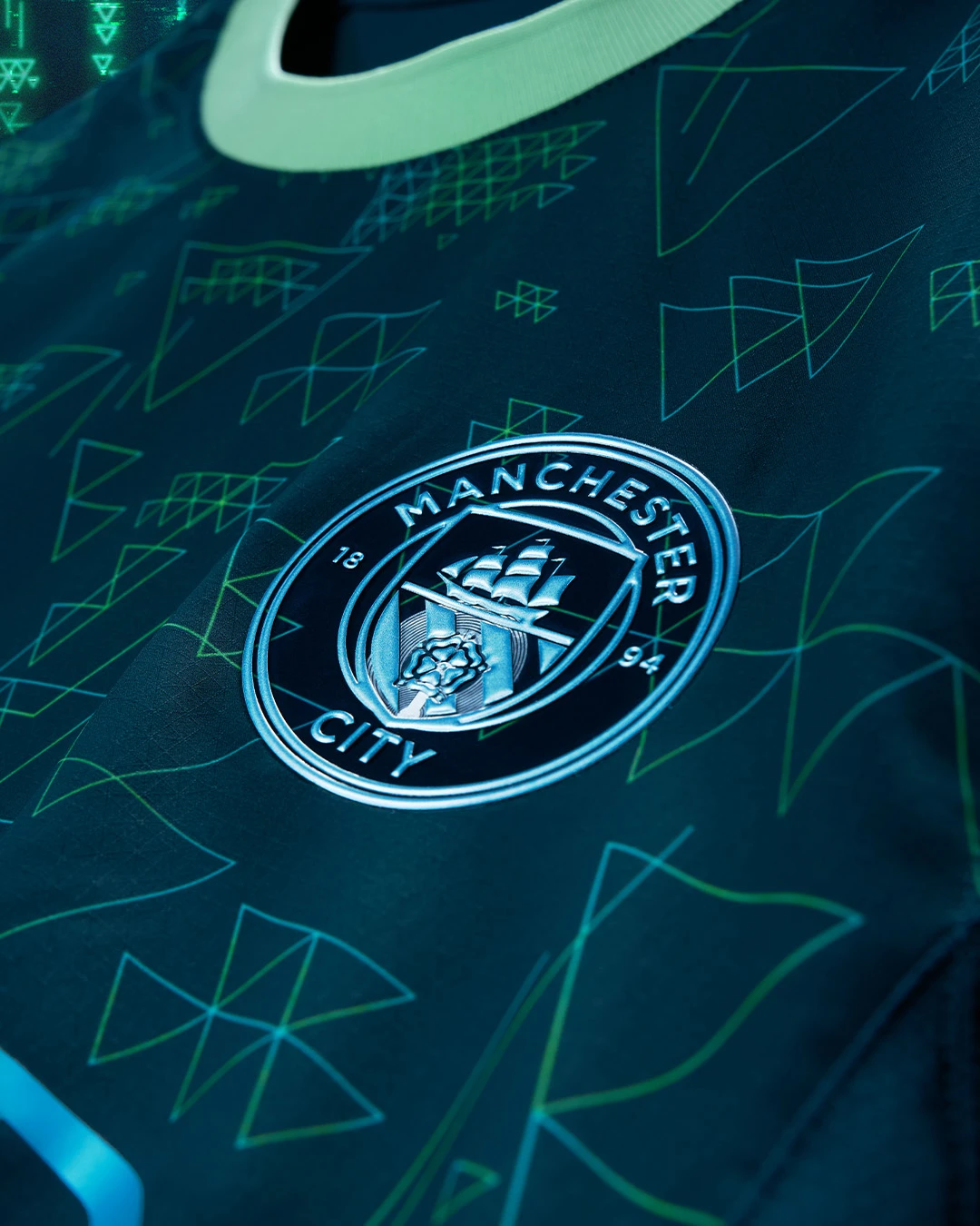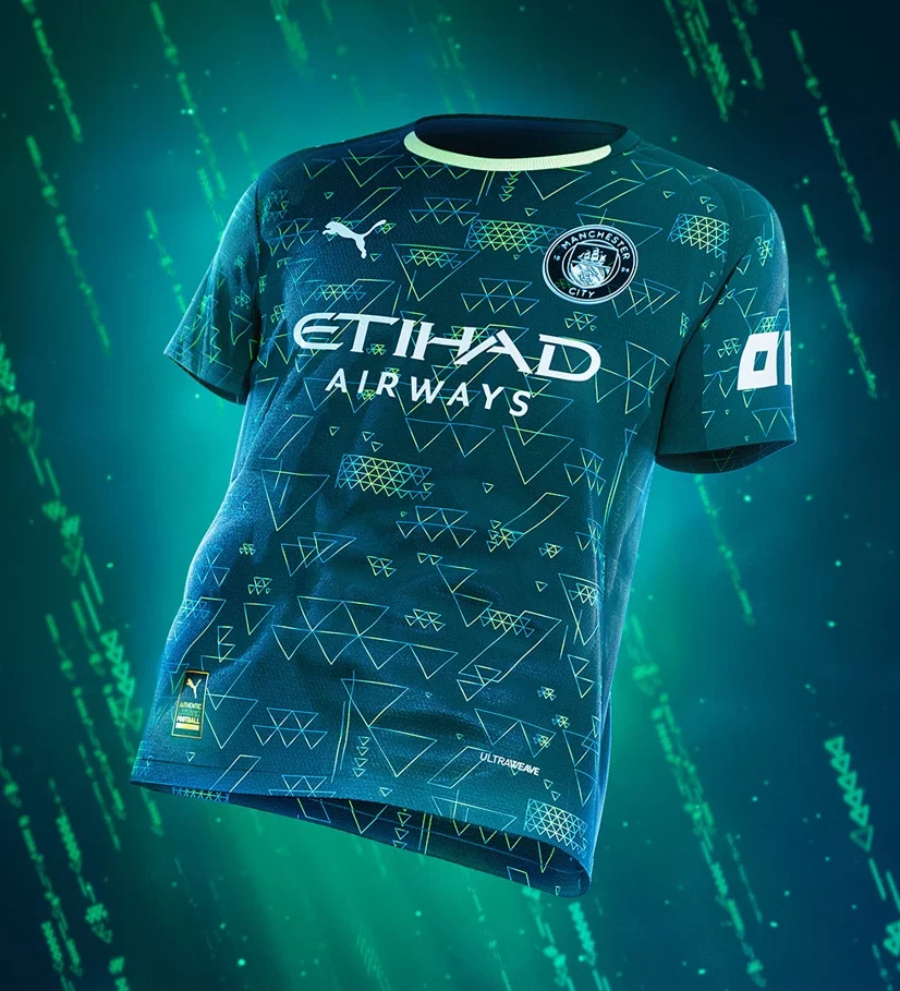 Pour leur quatrième maillot de la saison 2025-2026, les Citizens sont partis sur un vert foncé orné de motifs triangulaires turquoise métalliques, en référence au logo de la licence EAFC. Le tout donne un petit côté « Matrix » pas dégueu du tout.