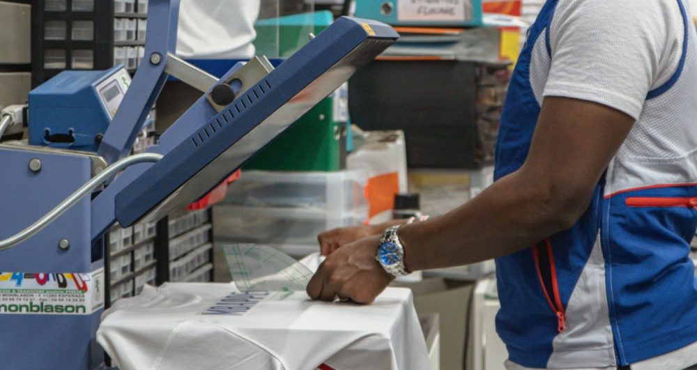 Déjà, pour des gros volumes, on l’imprime avec un écran de sérigraphie, une encre de nature différente. Ensuite, c’est séché dans des tunnels industriels. Puis, toujours à la fin, on met un adhésif thermofusible. Lors de l’impression, on travaille évidemment en effet miroir. Et le tour est joué.