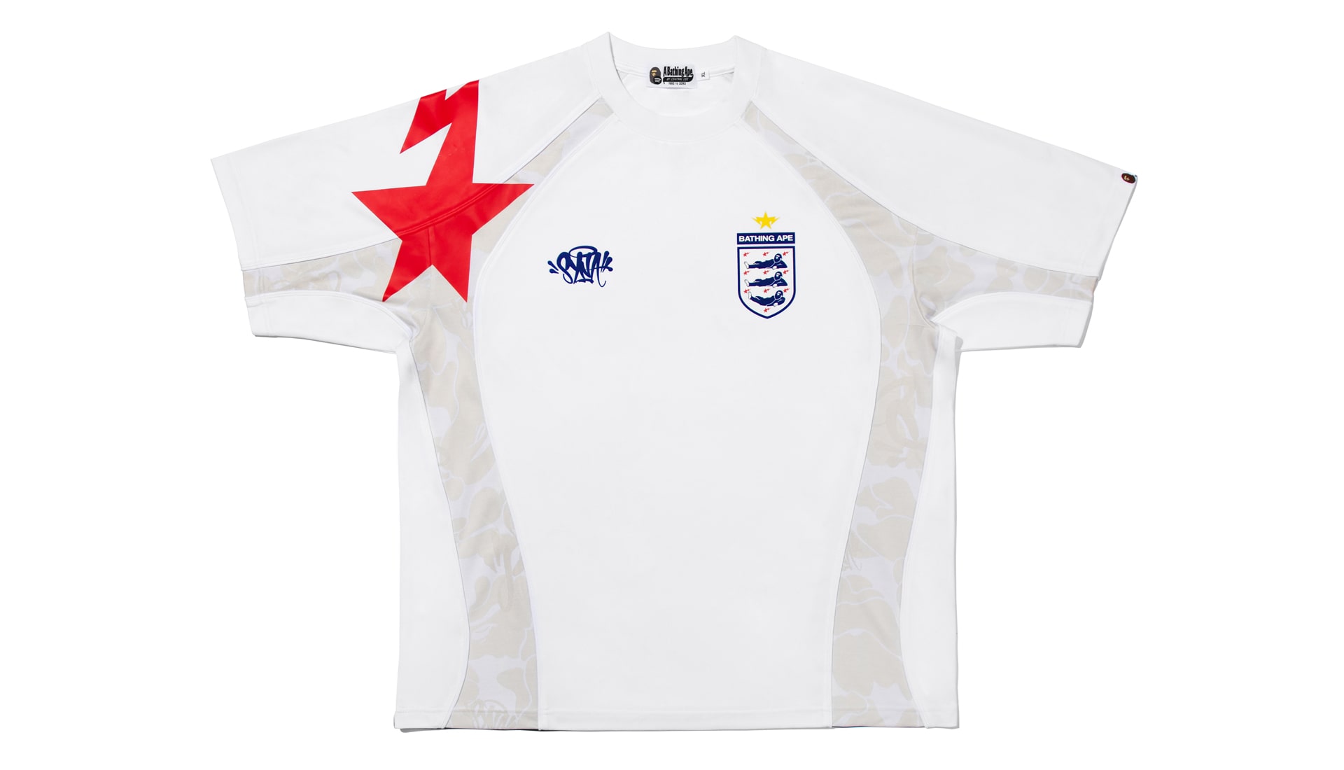 Avec le rappeur britannique Central Cee à la baguette, Bape, Spotify et Syna ont dévoilé ce mardi une nouvelle capsule lifestyle, parmi laquelle se trouve un joli maillot clin d'œil à celui de l'Angleterre en 2006.