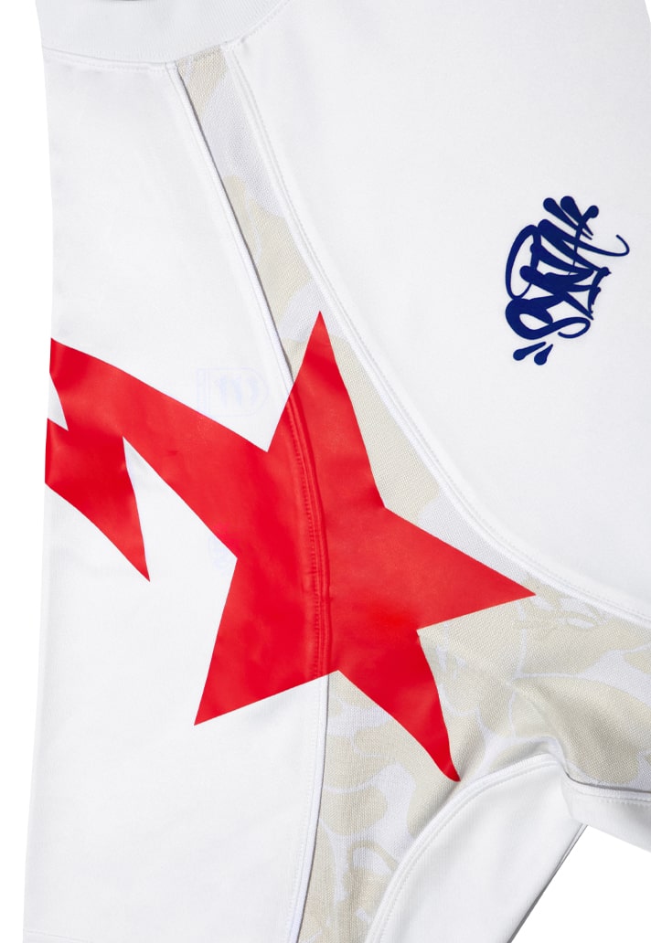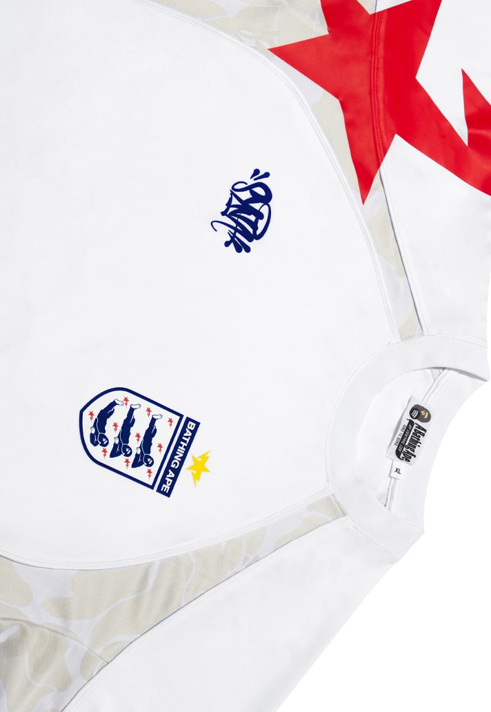 L’hommage envers le maillot de la sélection anglaise se veut officieux : les trois lions de l’écusson ont été remplacés par les singes emblématiques Bape. La croix rouge sur l’épaule, quant à elle, a été remplacée par l’étoile de Syna World. Un lifting à l’anglaise.