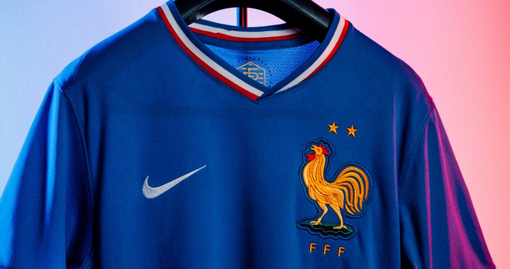 2024 : Nike frappe un très grand coup avec maillot d’une incroyable beauté. Retour du bleu roi, du col tricolore et surtout, du gros coq brodé sur la poitrine. Ce maillot ressemble comme deux gouttes d’eau à celui utilisé lors du Mondial 1966 en Angleterre. Pas forcément un très grand souvenir, les Bleus ayant finis derniers de leur poule. Mais l’équipe de France 1966 n’avait pas Mbappé, ni Griezmann… Le maillot extérieur, lui, est blanc avec de fines rayures multicolores, un peu comme le maillot away des années 80. Bref, deux maillots aux inspirations vintage, qui siéraient parfaitement à de futurs champions d’Europe.